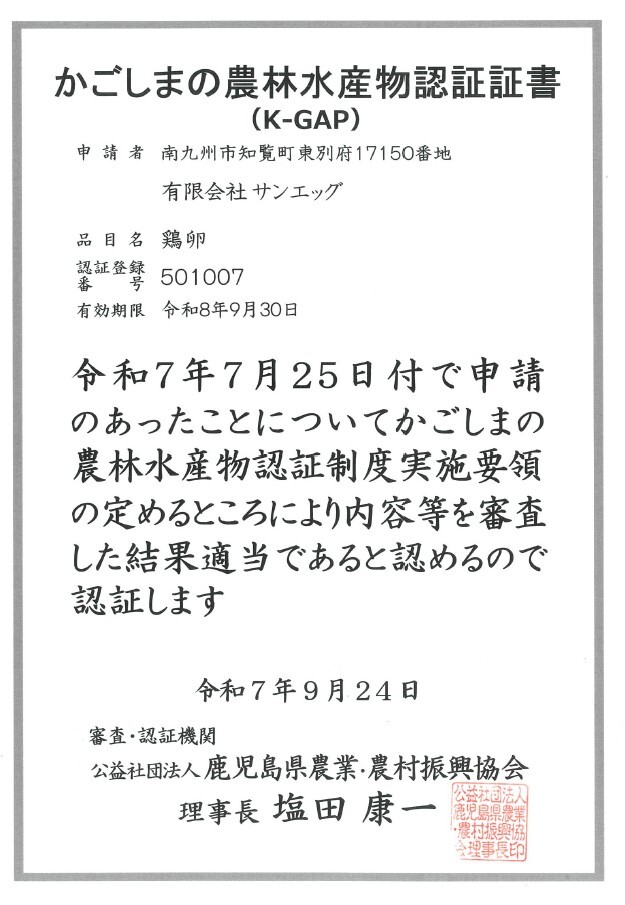 2005年9月20日、制定前からの活動が評価され「かごしまの農林水産物認証制度」で鶏卵品目の第1号認証を取得しました。